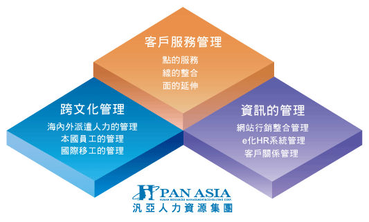 為符合所有企業之整合性、跨國性、前瞻性思維,汎亞網羅兩岸將跨國人才擺在第一陣線,以卓越、高效能、高遠見之前瞻開創事業服務系統,打下穩固的競爭力,邁向國際舞台。